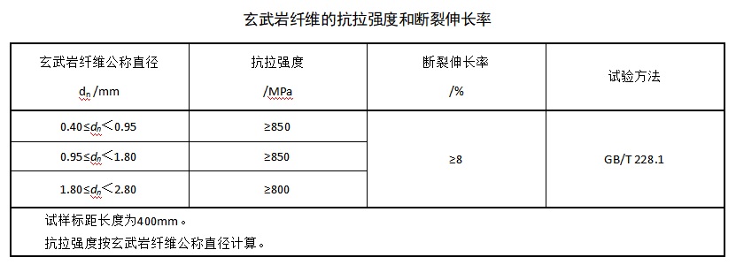 玄武巖纖維公稱直徑 dn /mm | 抗拉強(qiáng)度 /MPa | 斷裂伸長(zhǎng)率 /% | 試驗(yàn)方法 |